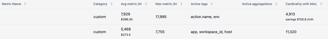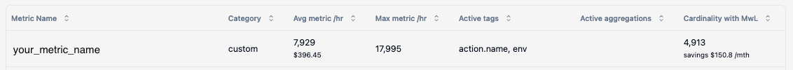 Finally, we estimate the new cardinality after applying the Metrics without Limits feature, which in this case is 4,913. In our case, we can save 7,929 - 4,913 of cardinality for this metric which would have an impact of $150.8/month.
