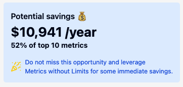 First, navigate to Dataiker > usage > metrics . You’ll immediately see the potential savings from applying MwL to your top 10 metrics!