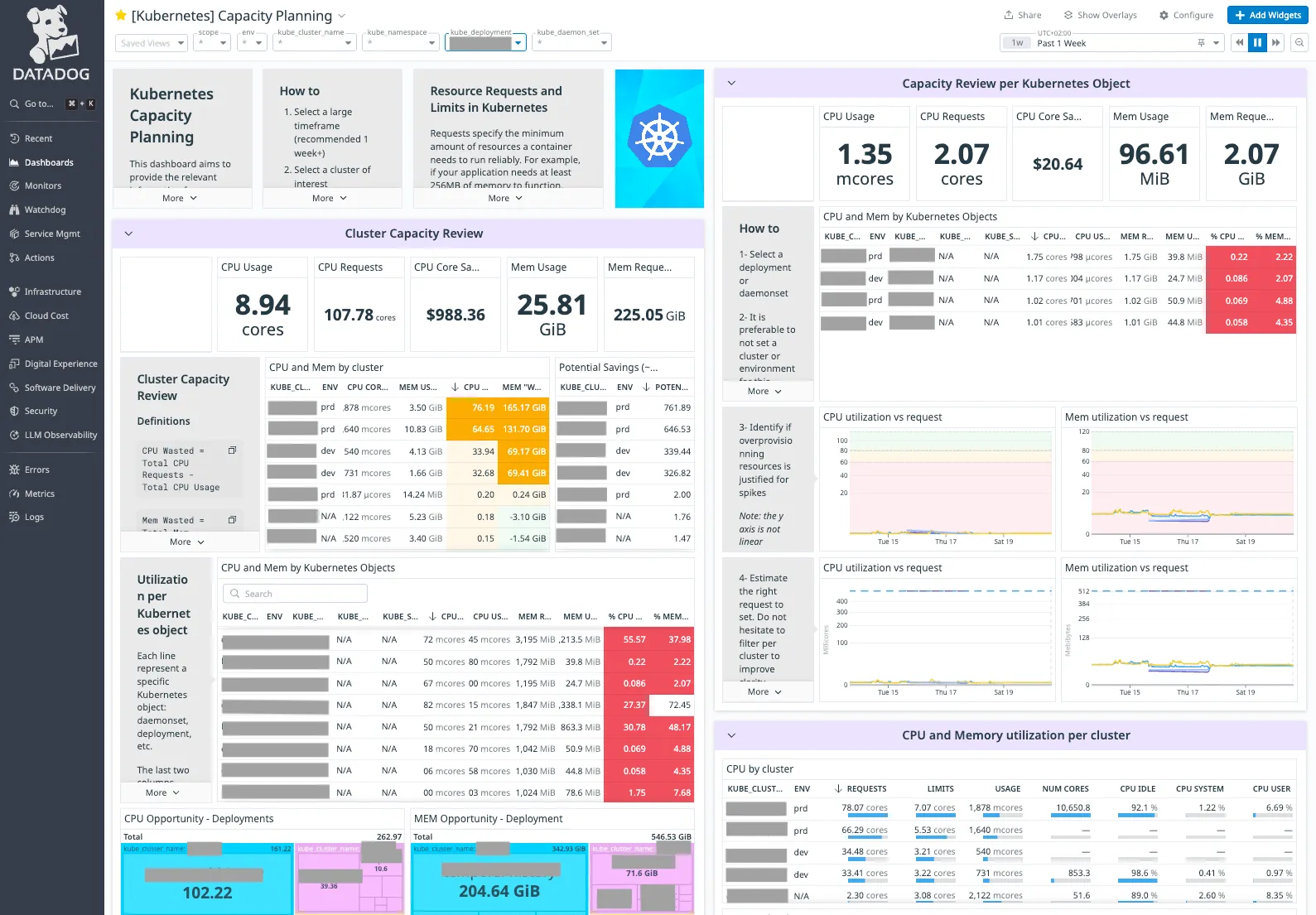 Datadog’s platform provides a real-time comparison of live usage versus requested resources, enabling teams to track inefficiencies.