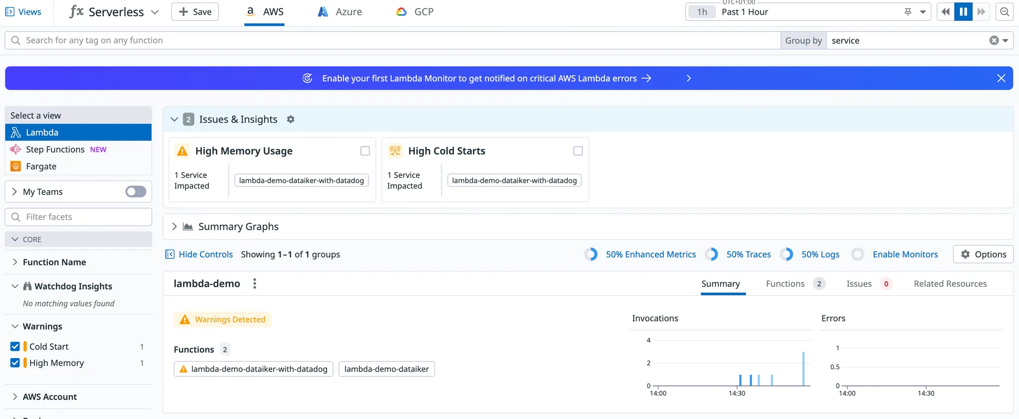 Datadog Serverless View with Issues and Insights