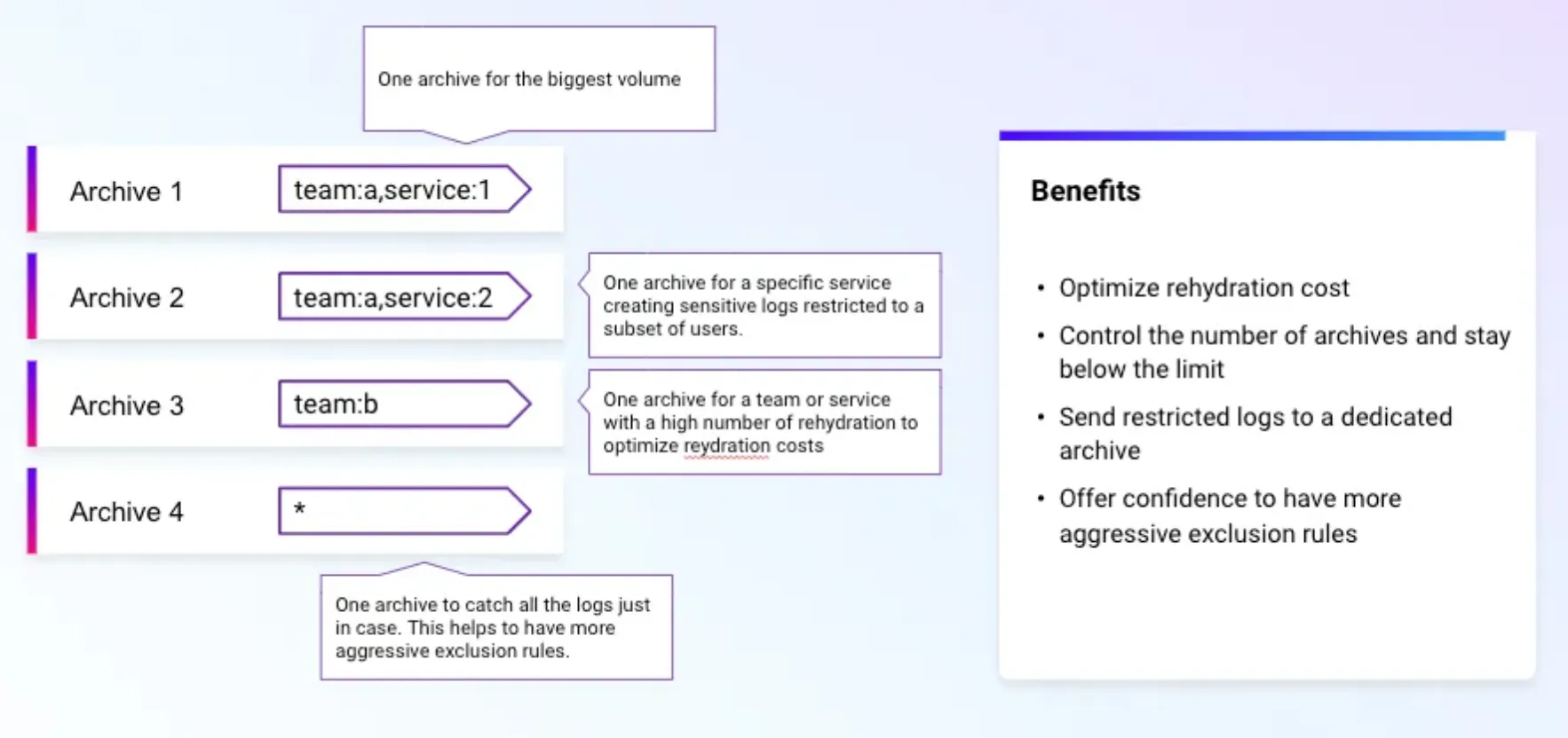 1. Team-specific Archives: Logs governed by specific teams with stringent access protocols warrant dedicated archives. Employing a unified tag (e.g., `team:security`) simplifies identification and management.