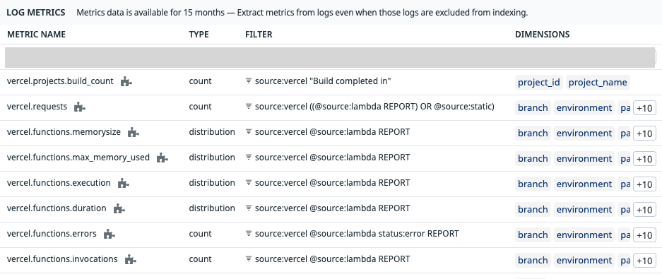 It's important to note that although Vercel integration includes metrics, these metrics are derived from logs themselves. You can review the default log-to-metric configurations here.