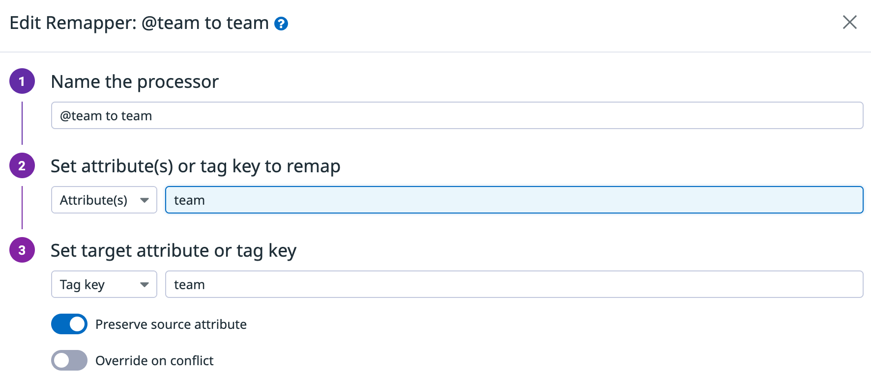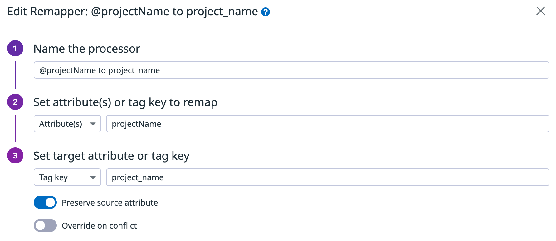 Project Name Tags: Similarly, map the attribute @projectName to the tag project_name. This alignment simplifies dashboard filtering, making metrics and logs consistent.