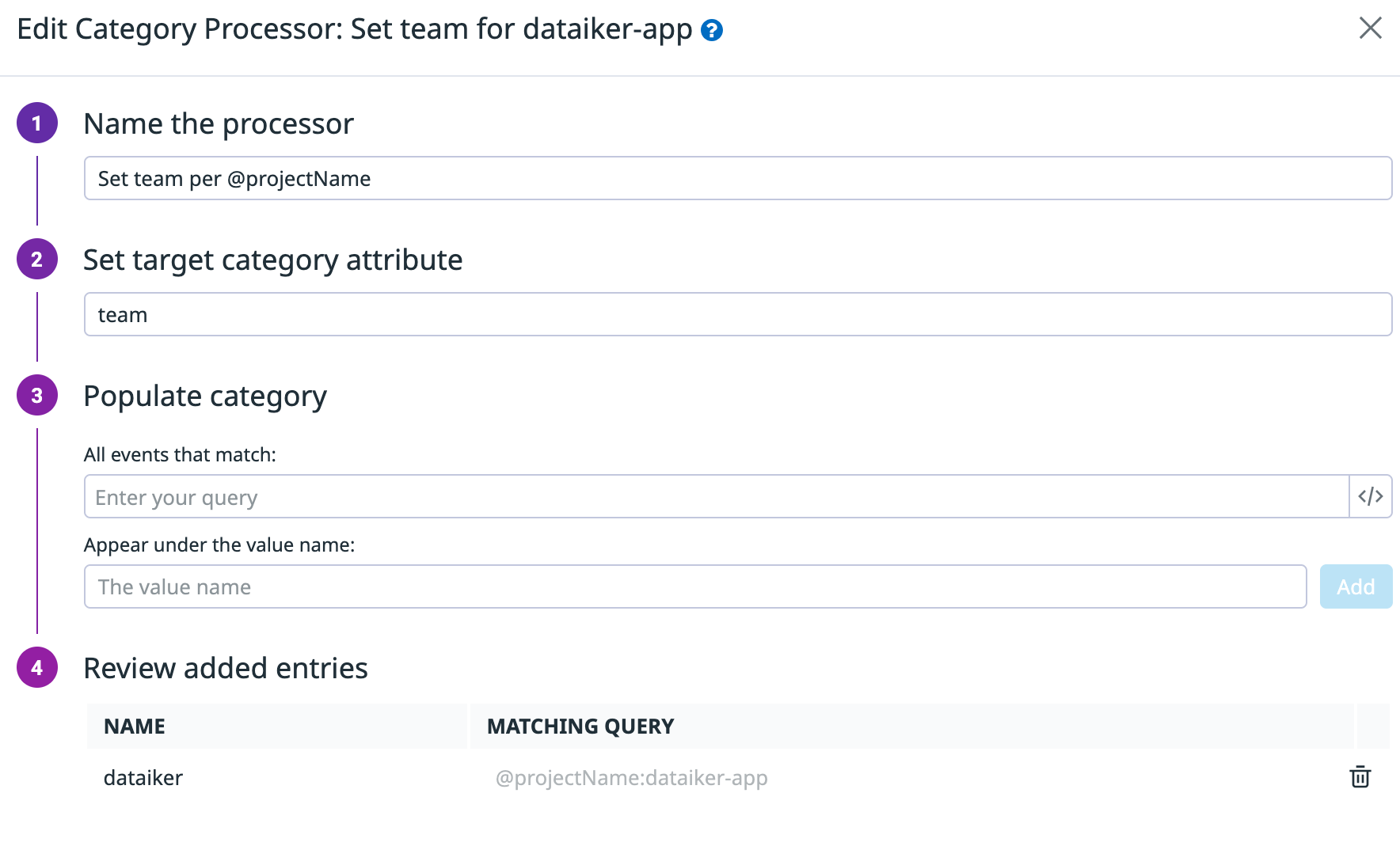 Team Tags: In large organizations, multiple teams may generate logs from different projects. Assigning a team tag to logs based on @projectName makes it easy to filter logs relevant to your team. You can achieve this using a category processor.