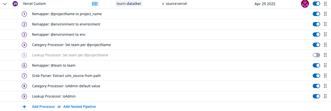 Environment Tags: Vercel logs contain an attribute called @environment. You can use Datadog’s remapper processor to map this attribute to tags env and environment.