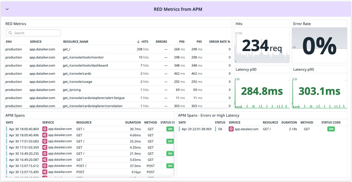 - APM Metrics: Standard RED (Rate, Errors, Duration) metrics, alongside specific queries to track spans, errors, and latency issues. For instance, in our case, we added a span query for errors and high latency spans.