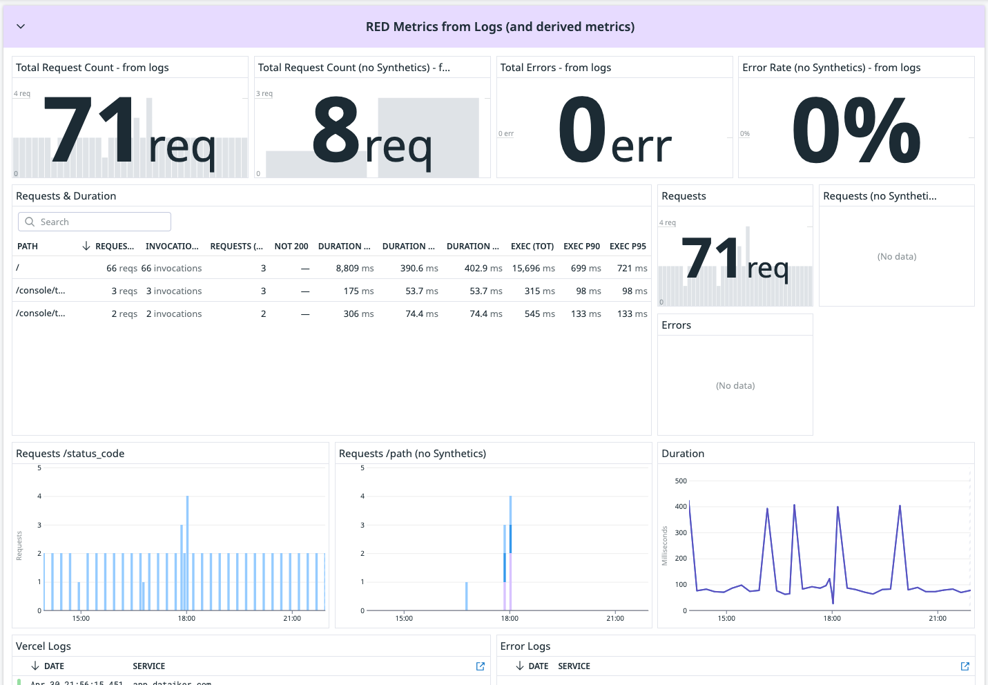 Once you have enhanced logs and APM configured, you can leverage your own Datadog custom dashboards to visualize this data effectively. Here’s what an advanced Vercel dashboard includes: