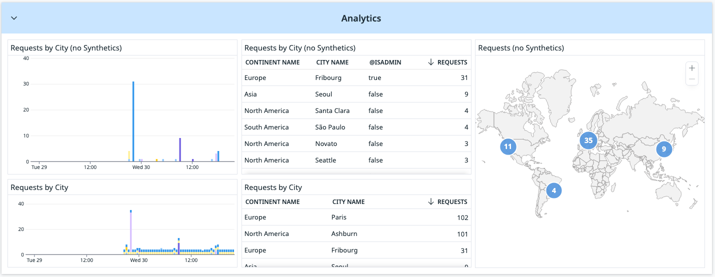 - Log Insights: Logs visualization and Metrics derived from logs. From the log itself, we also excluded in some widgets the synthetic traffic thanks to our custom pipeline which exposes the