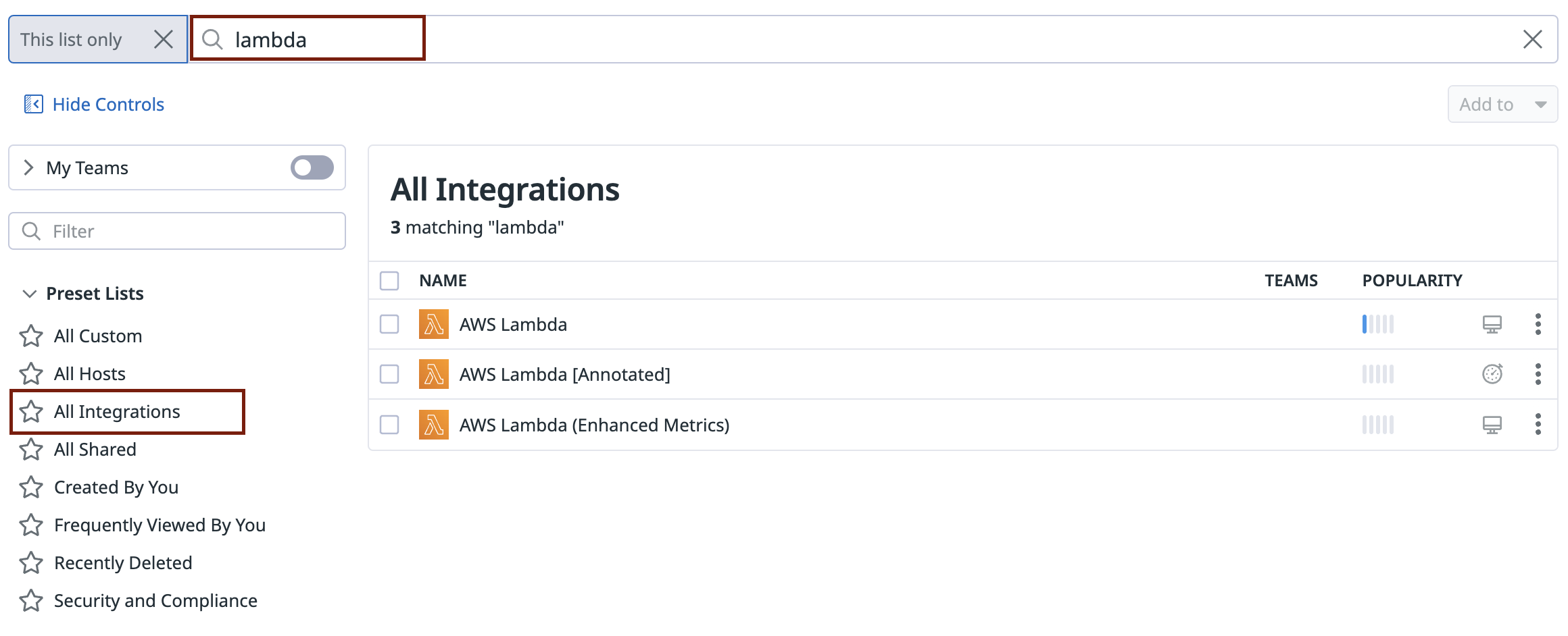 To get started Datadog includes a few default dashboards. Go to your dashboard list, click on all integrations and search for Lambda. Our goal would be to ensure they all include data.