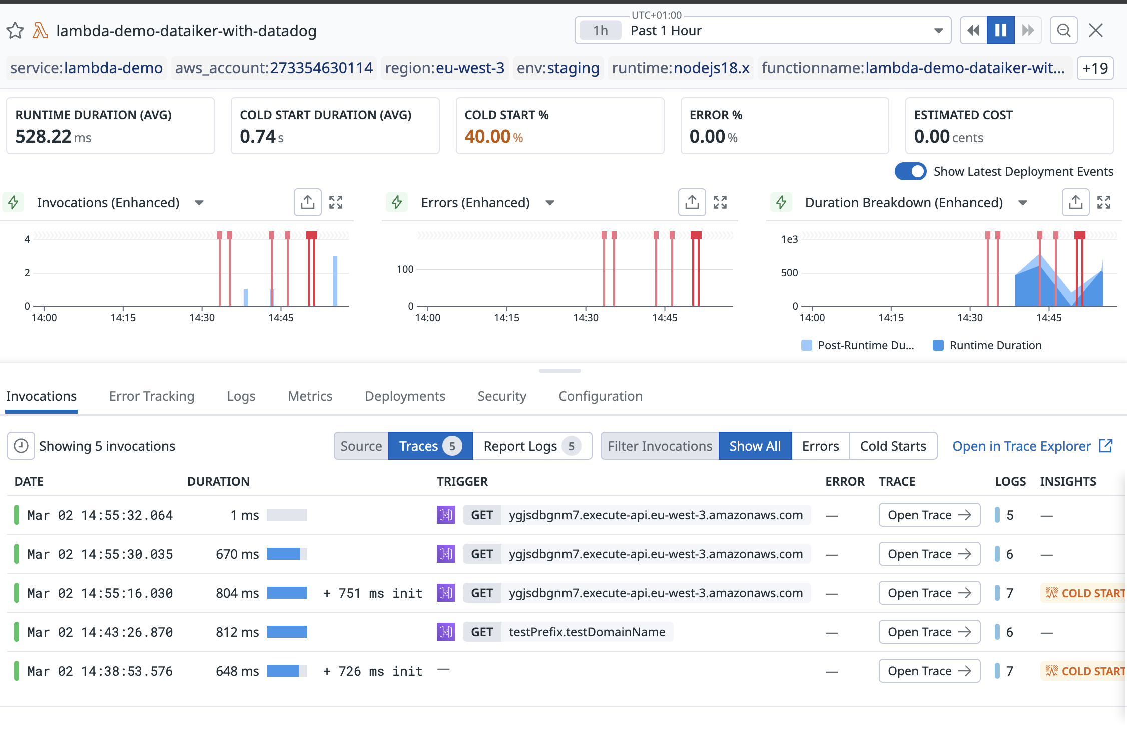 Below we can start the previous invocations incuding the one with a cold start. A lot of metadata are collected at the top but I also want you to pay attention to the multiple tabs. As always, Datadog principle is to aggregate multiple data source into a single view. With those tabs, easily check your lambda logs, their metrics, the previous deployments and its configuration without leaving the platform. From the invocations tab, the traces are also available to see.