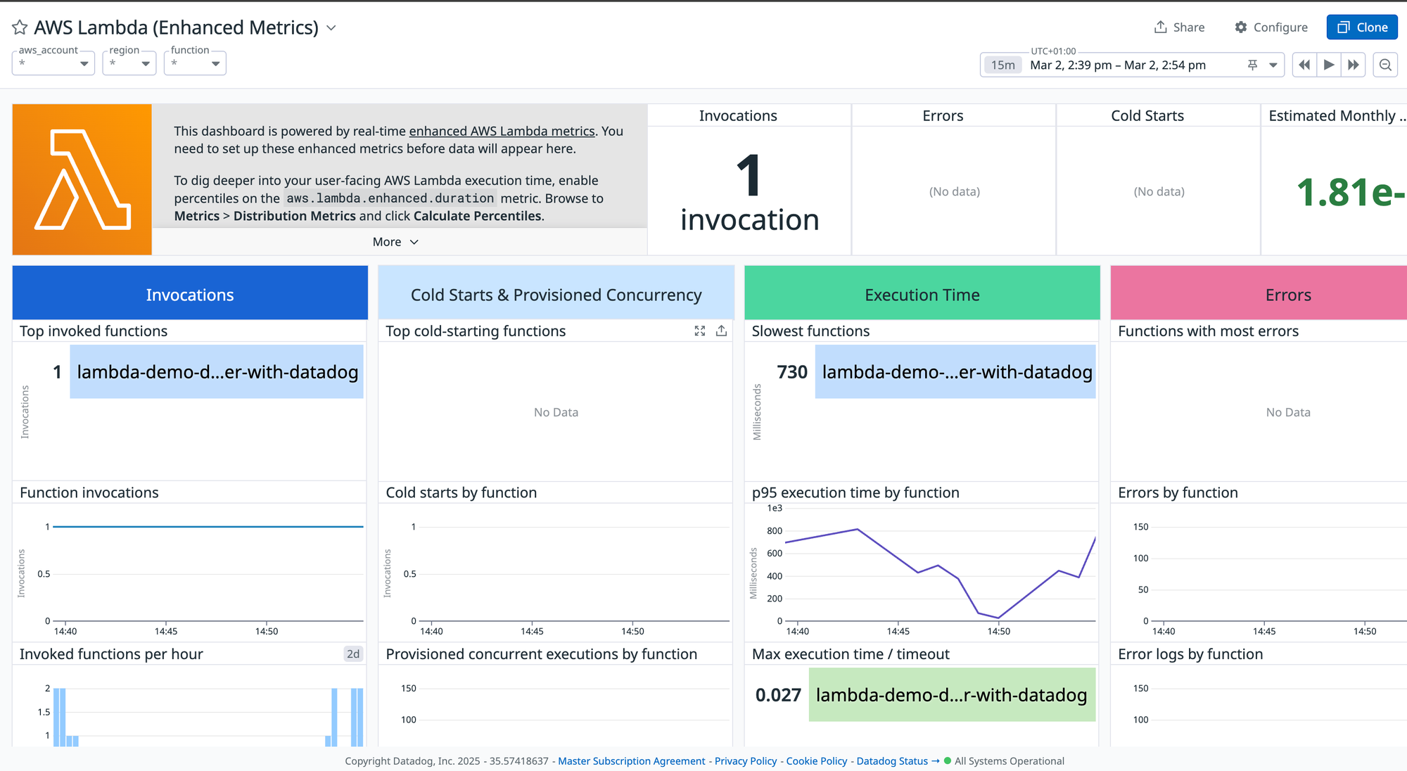 Once data flows into Datadog, the AWS Lambda dashboard provides key insights.