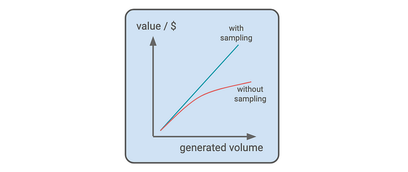 In terms of scalability, as systems grow in usage, the quantity of logs escalates proportionally, leading to escalating volume and costs. This is where lies the first opportunity: while volume raises, the value captured from logs may not scale at the same rate. For instance, receiving 1,000,000 OK logs will provide a similar value as 10,000,000 of OK logs. This is where sampling emerges as a powerful tool, preserving value while mitigating costs. This concept is exemplified by Datadog’s Logging without Limits, where exclusion rules optimize the value for growth ratio.